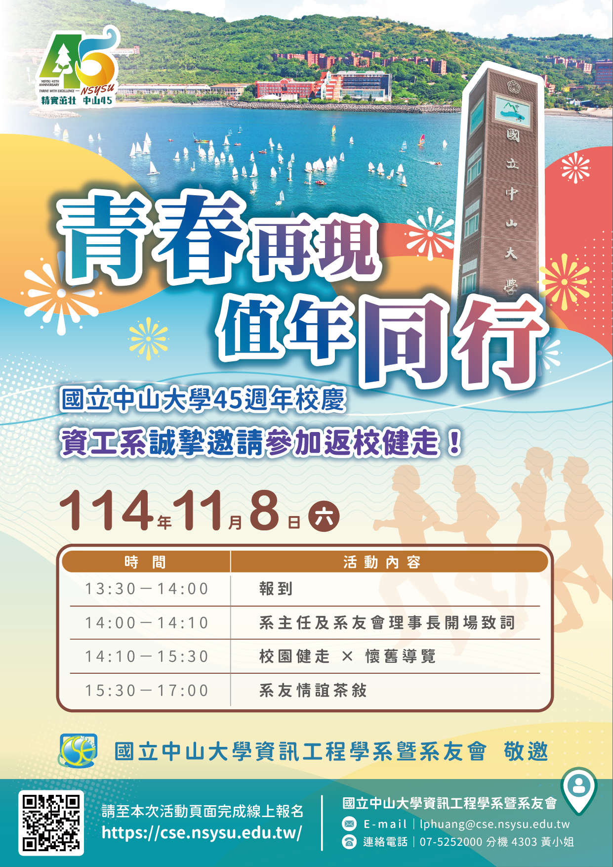 邀請各屆系友攜家帶眷返校健走,讓系友再次重返校園,用雙腳感受中山大學的蛻變!