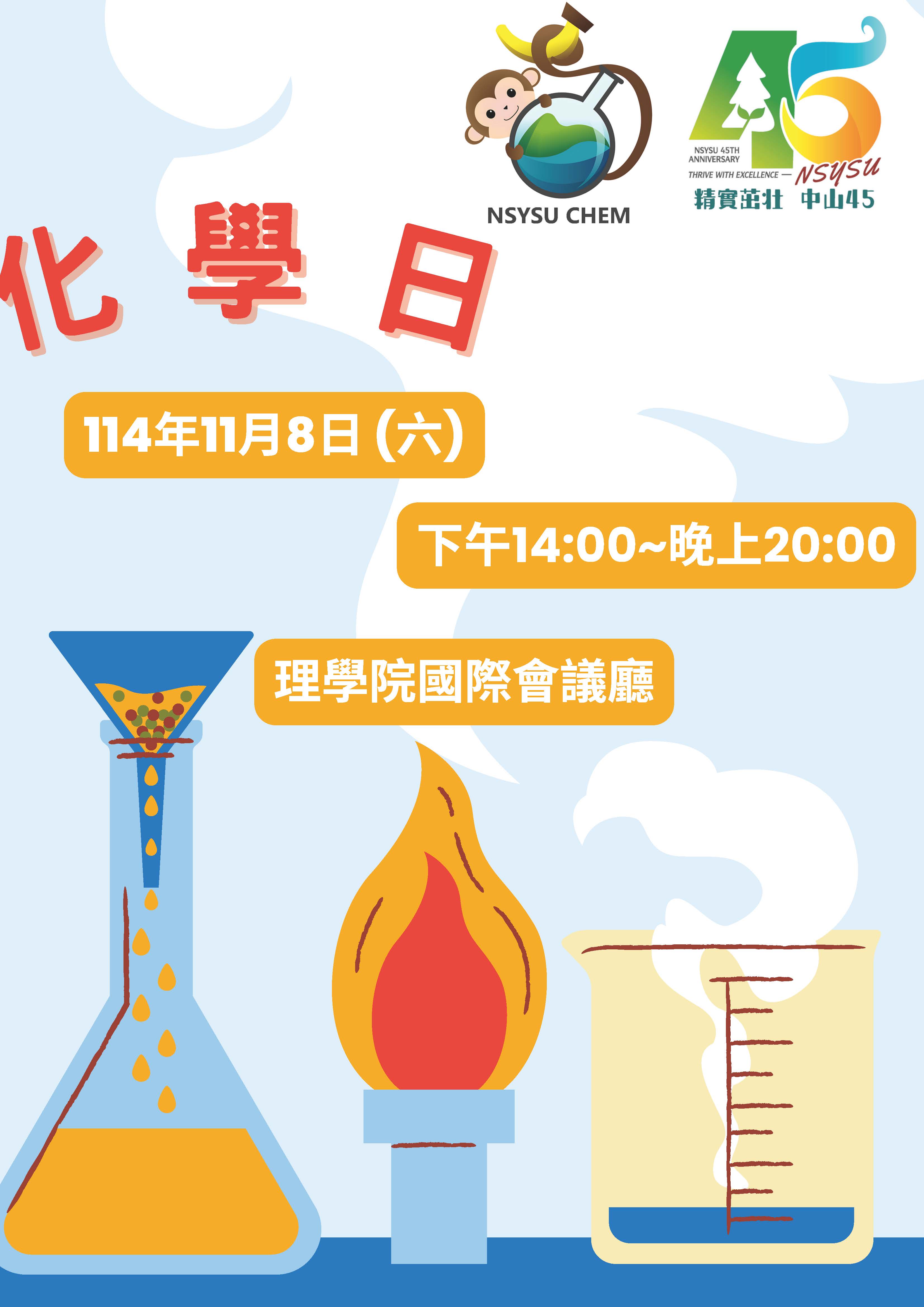 為增進學生對化學的興趣與了解,並促進系友間的交流與合作,中山化學系特舉辦「化學日」活動,結合系友分享、有獎徵答與晚會等多元活動,提供師生與系友一個互動、學習與娛樂兼具的平台。