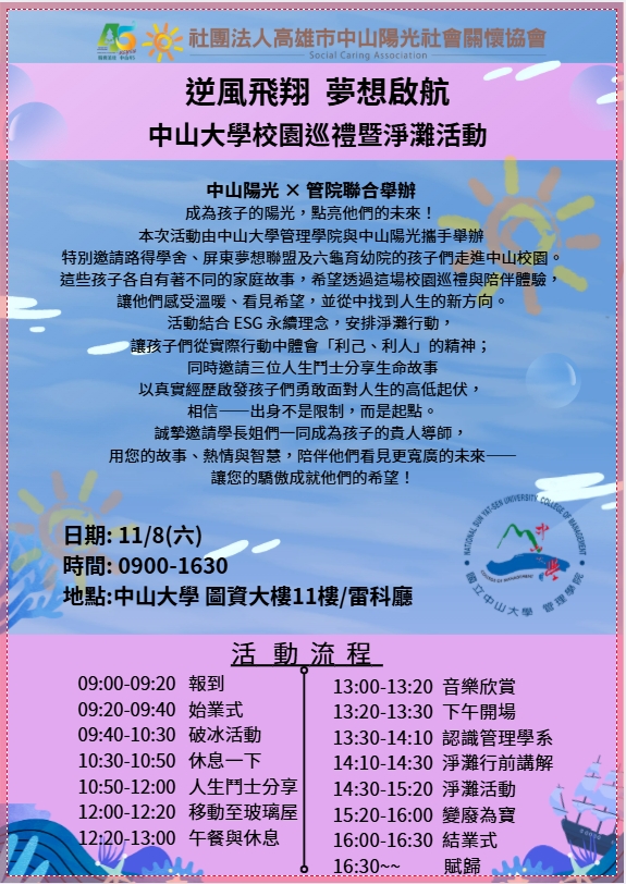 由國立中山大學管理學院與由中山陽光關懷協會策劃主辦,結合校慶45週年系列慶祝活動與大學社會責任(USR)核心精神。透過一整日的深度參與與多元活動安排,期望讓參與者實際接觸高等教育場域,開啟對未來學習與職涯的初步想像,減少其對大學的陌生感與距離感,並在互動與肯定中建立自我價值與希望感。