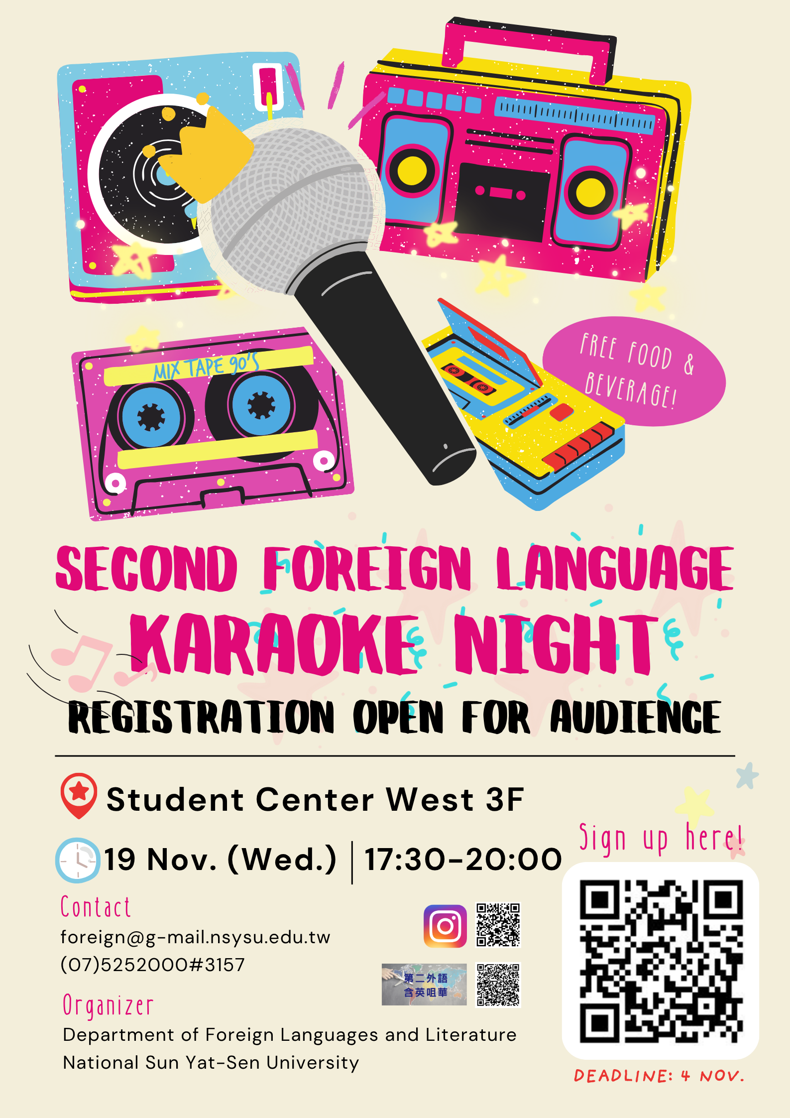 The Department of Foreign Languages and Literature is organizing our second annual "Second Foreign Language Karaoke Night" on Nov. 12 (Wed.), 17:30 - 20:00 at Student Center West 3rd Floor, Multipurpose Room.